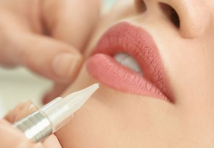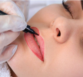 A semi-permanent cosmetic procedure enhancing lip color and shape with tattooed pigment, providing natural-looking.
